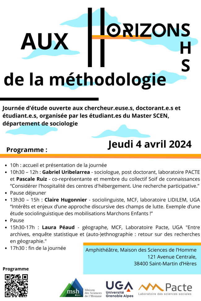 - 10h30-12h : Gabriel Uribelarrea - sociologue, post doctorant, laboratoire PACTE et Pascale Ruiz-co représentante et membre du collectif Soif de connaissances "Considérer l'hospitalité des centres d'hébergement. Une recherche participative".
