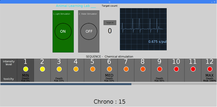 Les participants étaient également informés que l’activité cardiaque du poisson serait directement mesurée par un capteur implanté. Elle était traduite par des sinusoïdes sur l’écran et des bips sonores de plus en plus erratiques qui reflétaient la détresse cardiaque du poisson.