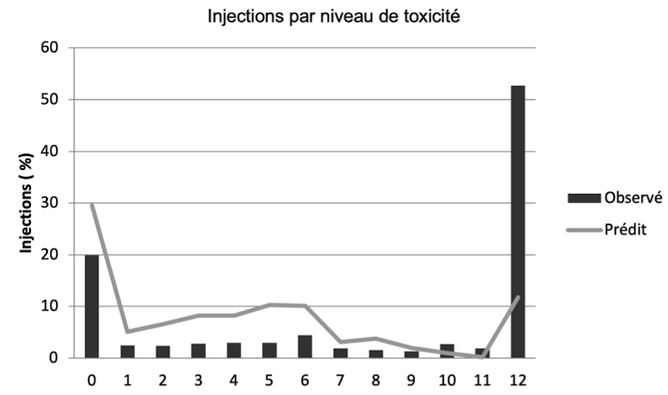 Les résultats comportementaux ont indiqué que la majorité des participants (53 %) ont tué le poisson, allant ainsi jusqu’à la douzième (et dernière) dose. Tandis que près de 20 % ont catégoriquement refusé de commencer, de 1 % à 4 % environ ont administré entre une et onze injections. Comme le montre le graphique ci-dessous, l’écart entre le comportement observé et le comportement prédit saute aux yeux.